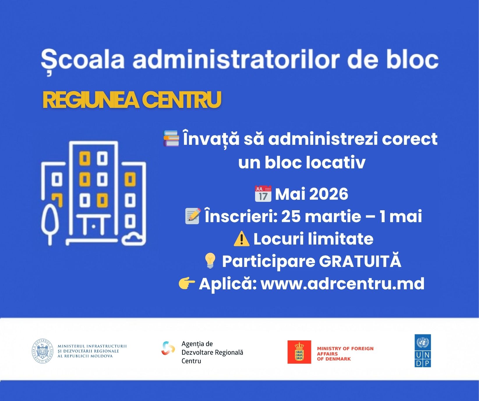 Perioada de desfășurareCursurile vor avea loc în luna mai 2026, iar detaliile privind locația și programul instruirilor vor fi comunicate ulterior. ÎnscriereÎnscrierile sunt deschise în perioada 25 martie - 1 mai 2026. Confirmarea participării va fi transmisă prin e-mail. Formularul de înscriere poate fi completat accesând: https://s9.ro/2jqn Importanța programuluiOrganizarea acestor instruiri reprezintă o intervenție importantă pentru îmbunătățirea managementului blocurilor locative din orașele Regiunii Centru. Prin consolidarea capacităților administratorilor și a potențialilor administratori, programul va contribui la: