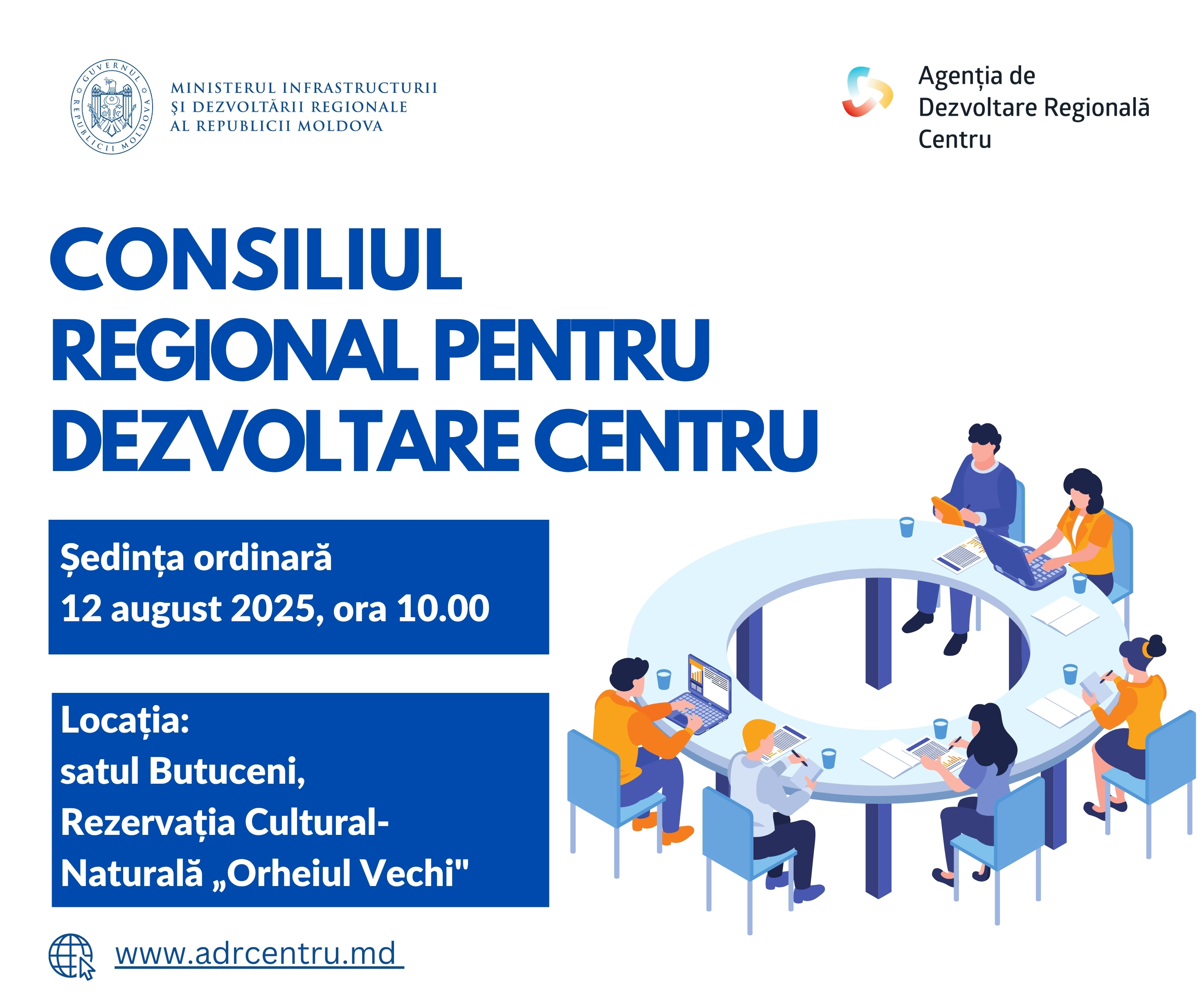 Agenția de Dezvoltare Regională (ADR) Centru informează că marți, 12 august 2025, va avea loc ședința ordinară a Consiliului Regional pentru Dezvoltare (CRD) Centru. Evenimentul se va desfășura începând cu ora 10:00, la Rezervația Cultural-Naturală „Orheiul Vechi", satul Butuceni, comuna Trebujeni, raionul Orhei. Ședința este organizată conform Regulamentului-cadru al CRD Centru, care stabilește activitatea și funcționalitatea acestuia. La eveniment sunt așteptați membrii CRD Centru, precum și alte părți interesate. Pe agenda ședinței se vor regăsi următoarele subiecte: