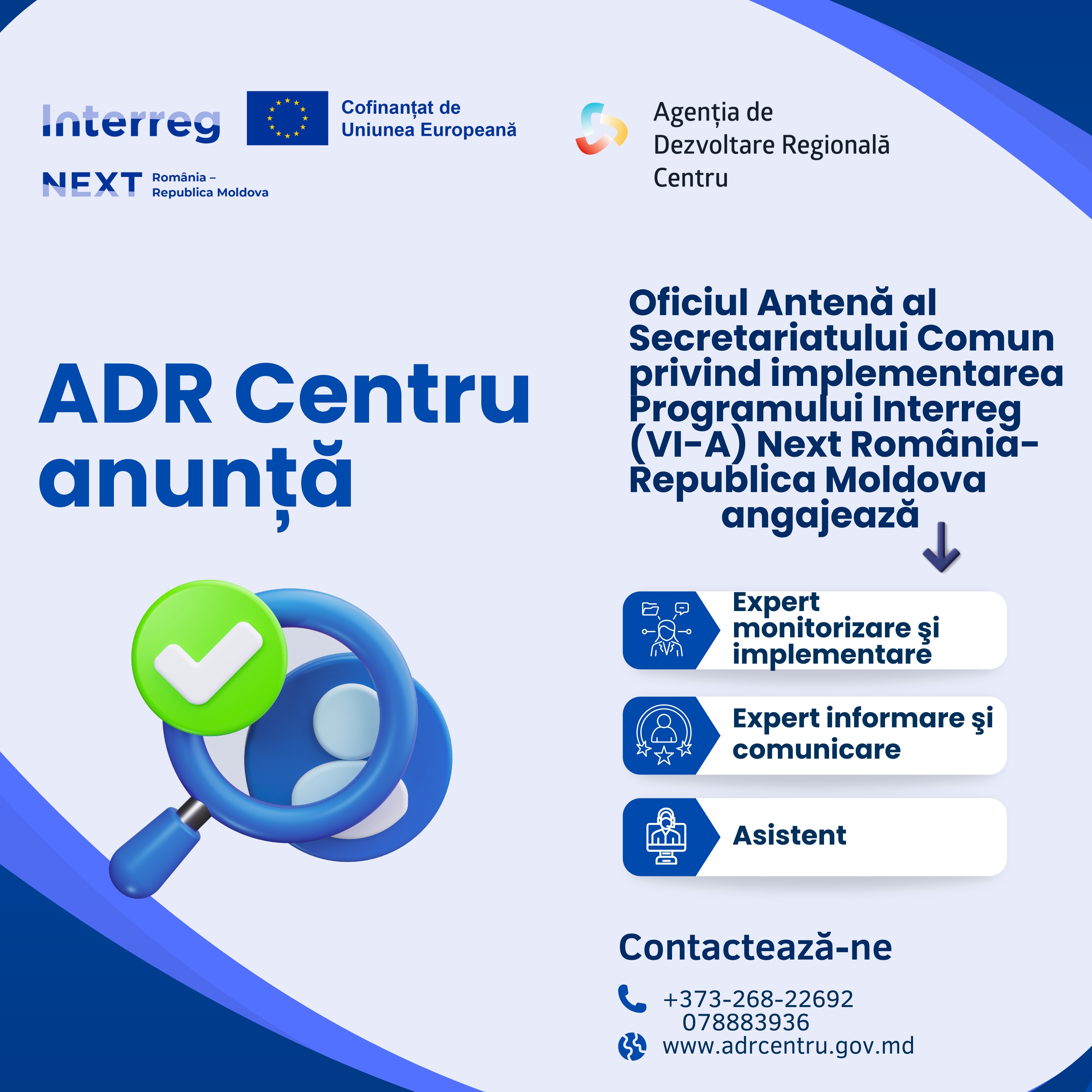 ADR Centru anunță concurs de angajare pentru suplinirea mai multor posturi vacante în cadrul Oficiului Antenă al Secretariatului Comun (OASC), responsabil de implementarea Programului Interreg (VI-A) Next România-Republica Moldova.