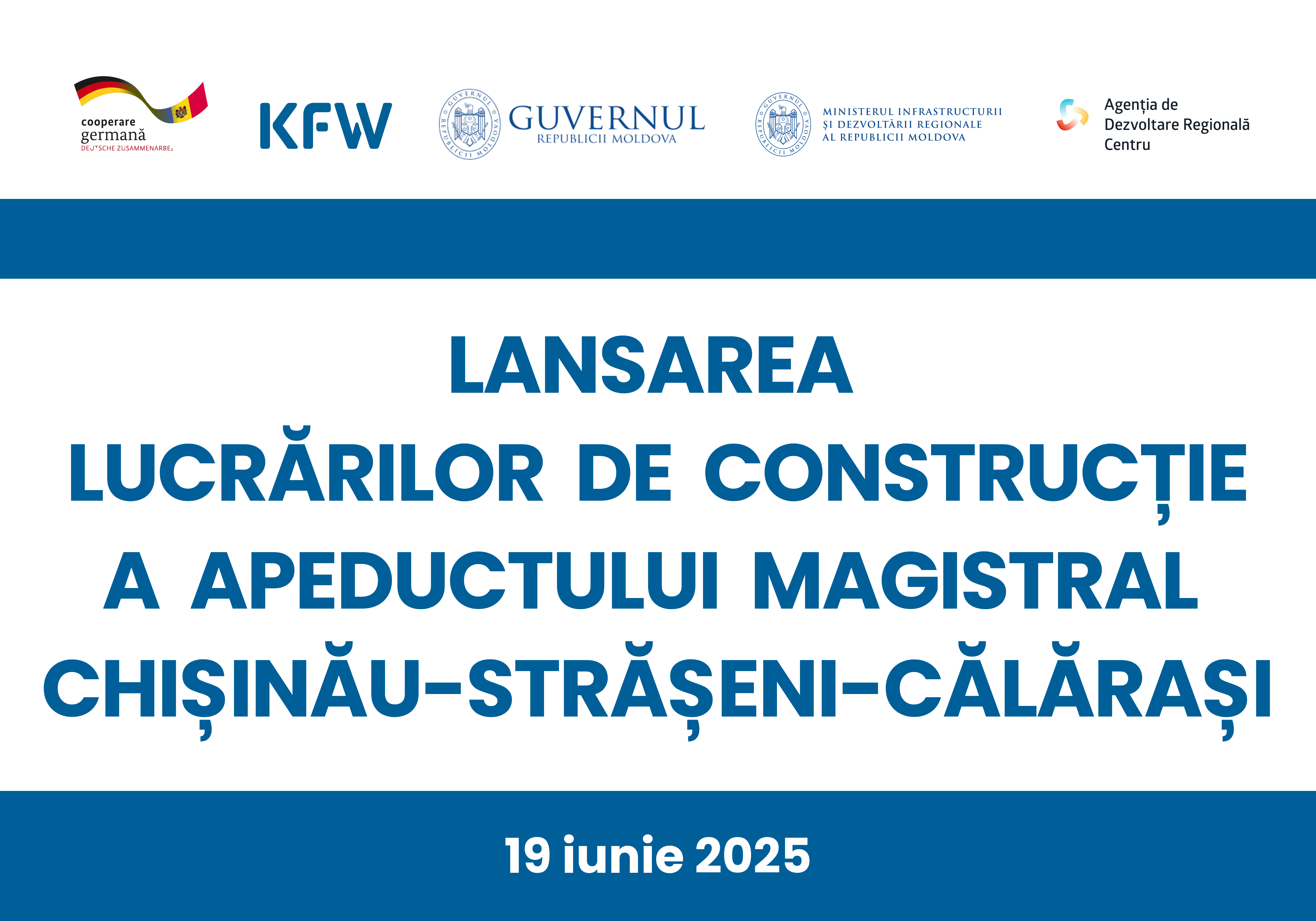 Ministerul Infrastructurii și Dezvoltării Regionale și Agenția de Dezvoltare Regională Centru CE? Invită instituțiile mass-media la evenimentul de lansare a lucrărilor de construcție a apeductului magistral Chișinău-Strășeni-Călărași CÂND? Joi, 19 iunie 2025, ora 10.00 Chișinău, Șoseaua Balcani 7/E. Coordonate locație: https://maps.app.goo.gl/XhUCkv8iRGJnSTzh6 Reprezentanți ai conducerii țării, membri ai corpului diplomatic, parteneri de dezvoltare, ministere, beneficiari ai proiectului de dezvoltare regională și reprezentanți mass-media.