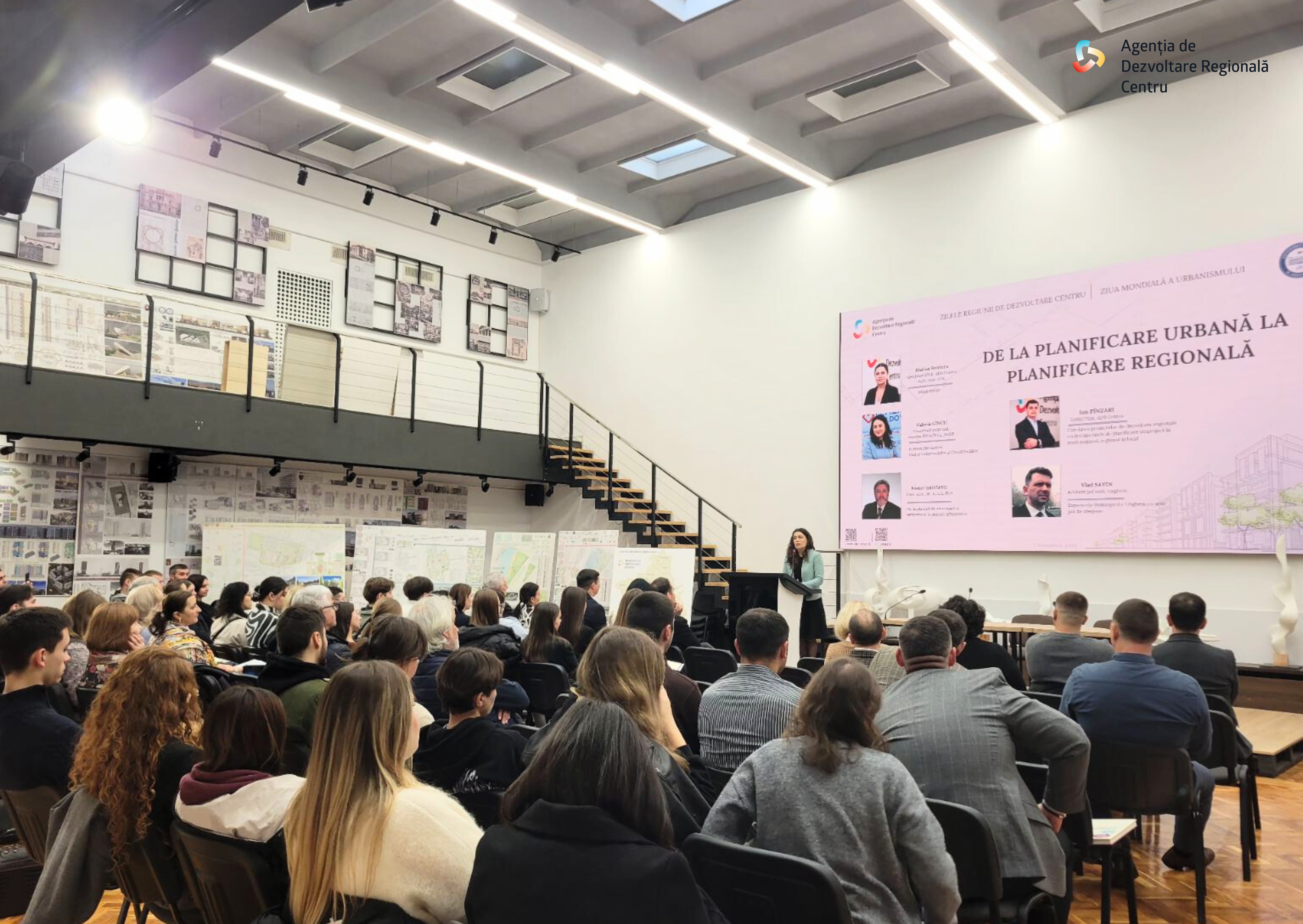 616 Accesări Chișinău, 7 noiembrie 2025 În ajunul Zilei Mondiale a Urbanismului, Agenția de Dezvoltare Regională Centru, în parteneriat cu Facultatea de Urbanism și Arhitectură a Universității Tehnice a Moldovei, a organizat evenimentul „De la planificare urbană la planificare regională" - o platformă de dialog și schimb de idei între practicieni, cadre universitare și autorități publice locale. Evenimentul, moderat de Marina Secrieru, specialist în planificare în cadrul ADR Centru și asistent universitar la FUA, a reunit profesioniști din domeniul dezvoltării teritoriale, arhitecți-șefi, experți ai ministerelor, reprezentanți ai mediului academic și studenți. „Această întâlnire nu este întâmplătoare. Ne aflăm într-un loc cu o puternică încărcătură simbolică - Facultatea de Urbanism și Arhitectură, locul unde mulți dintre noi am învățat să visăm orașe și regiuni mai bune. Totodată, evenimentul are loc în ajunul Zilei Mondiale a Urbanismului, un moment potrivit pentru a reflecta la responsabilitatea pe care o avem în modelarea spațiilor în care trăim", a menționat Marina Secrieru în deschiderea evenimentului. Cu mesaje de salut au venit Ion Pînzari, directorul ADR Centru, și Eugeniu Brăguța, decan interimar al Facultății de Urbanism și Arhitectură. „Planificarea urbană și cea regională trebuie să meargă mână în mână. Doar atunci proiectele devin mai mult decât construcții pe hârtie - devin povești vii de dezvoltare, care transformă comunitățile", a subliniat Ion Pînzari. Patru perspective - o singură direcție: dezvoltarea coerentă a teritoriilor Prima parte a evenimentului a inclus o serie de prezentări tematice: