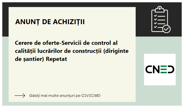 Cerere de oferte-Servicii de control al calității lucrărilor de construcții (diriginte de șantier) Repetat Instituția Publică Centrul Național pentru Energie Durabilă (IP CNED) anunță lansarea repetată a procedurii de achiziție a serviciilor de control al calității lucrărilor de reabilitare energetică a caselor individuale cu vulnerabilitate energetică extremă din Republica Moldova (diriginte de șantier) în cadrul Produsului de finanțare „Eficiența energetică a caselor individuale din gospodării rurale cu grad de vulnerabilitate energetică extremă", tranșa a 2-a. Procedura de achiziție se desfășoară în cadrul Programului FEERM, dezvoltat de Guvernul Republicii Moldova și implementat de către Centrul Național pentru Energie Durabilă și Ministerul Energiei. Programul este susținut financiar prin proiectul „Eficiență Energetică și Energii Regenerabile pentru Moldova" (E4M). Proiectul E4M este implementat de GIZ împreună cu Guvernul Republicii Moldova, fiind finanțat de Guvernul Germaniei și cofinanțat de Uniunea Europeană, Norvegia și Danemarca. Această componentă este finanțată de Uniunea Europeană. În cadrul prezentei proceduri de achiziție, IP CNED are drept scop identificarea și contractarea diriginților de șantier atestați, care vor presta servicii de control al calității lucrărilor de reabilitare energetică a caselor individuale cu vulnerabilitate energetică extremă, după cum urmează: