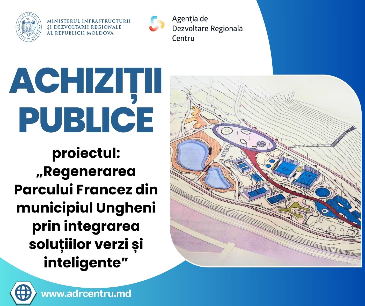 159 Accesări Anunțăm inițierea procedurii de achiziție publică pentru executarea lucrărilor în cadrul proiectului „Regenerarea Parcului Francez din municipiul Ungheni prin integrarea soluțiilor verzi și inteligente". Proiectul vizează amenajarea și modernizarea zonei verzi din preajma Palatului de Cultură Ungheni (Parcul Francez), situată în mun. Ungheni, sectorul Centru, str. Nicolae Bălcescu. Proiectul are drept obiectiv general creșterea rezilienței urbane și diminuarea efectelor schimbărilor climatice prin regenerarea strategică a Parcului Francez și îmbunătățirea calității vieții comunității din zona de revitalizare. Principalele lucrări planificate: