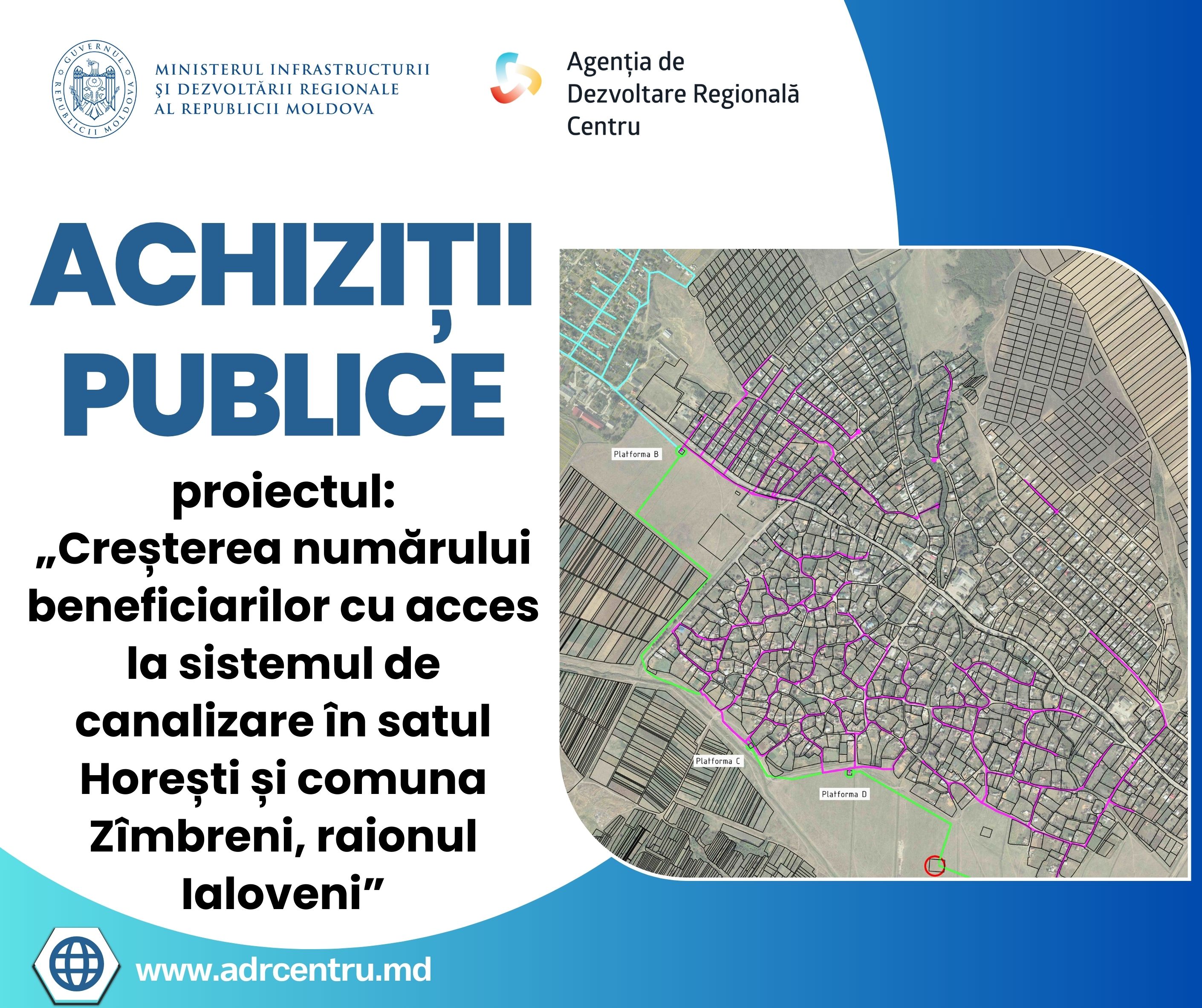 78 Accesări Anunțăm inițierea procedurii de achiziție publică pentru executarea lucrărilor de construcție a rețelelor de canalizare și a stațiilor de pompare din localitățile Zîmbreni și Horești pentru colectarea și pomparea apelor uzate la stația de epurare regională din localitatea Horești, r-nul Ialoveni. Proiectul regional are drept scop creșterea accesului populației la servicii publice de canalizare în localitățile Horești și Zîmbreni, raionul Ialoveni, prin construirea unei rețele integrate de canalizare și a stațiilor de pompare aferente, contribuind astfel la protecția mediului și la adaptarea regiunii la schimbările climatice. Prin implementarea proiectului se preconizează: