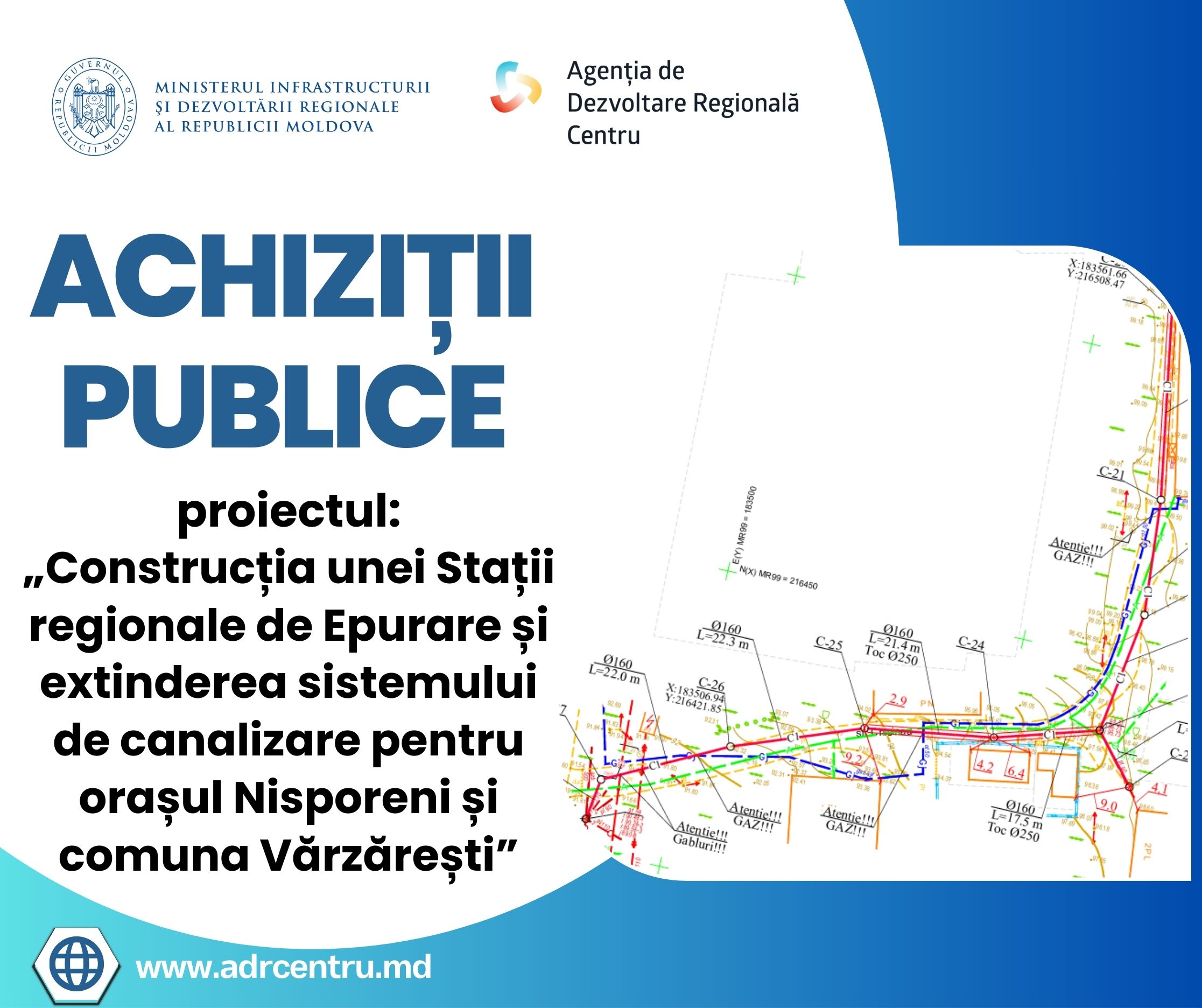 111 Accesări Agenția de Dezvoltare Regională Centru anunță inițierea procedurii de achiziție publică a lucrărilor de construcție a unei Stații regionale de Epurare și extindere a sistemului de canalizare pentru orașul Nisporeni și comuna Vărzărești. Procedura vizează executarea lucrărilor de construcție a unei Stații de Epurare Biologică de Tip BIOFIX regionale, cu capacitatea de 2.400 m³/zi, precum și extinderea rețelei de canalizare pentru orașul Nisporeni și comuna Vărzărești. Proiectul are drept obiectiv general soluționarea problemei apelor uzate din orașul Nisporeni și localitățile conexe, contribuind la protecția mediului și la creșterea accesului populației la serviciul public de canalizare. Rezultatele proiectului: