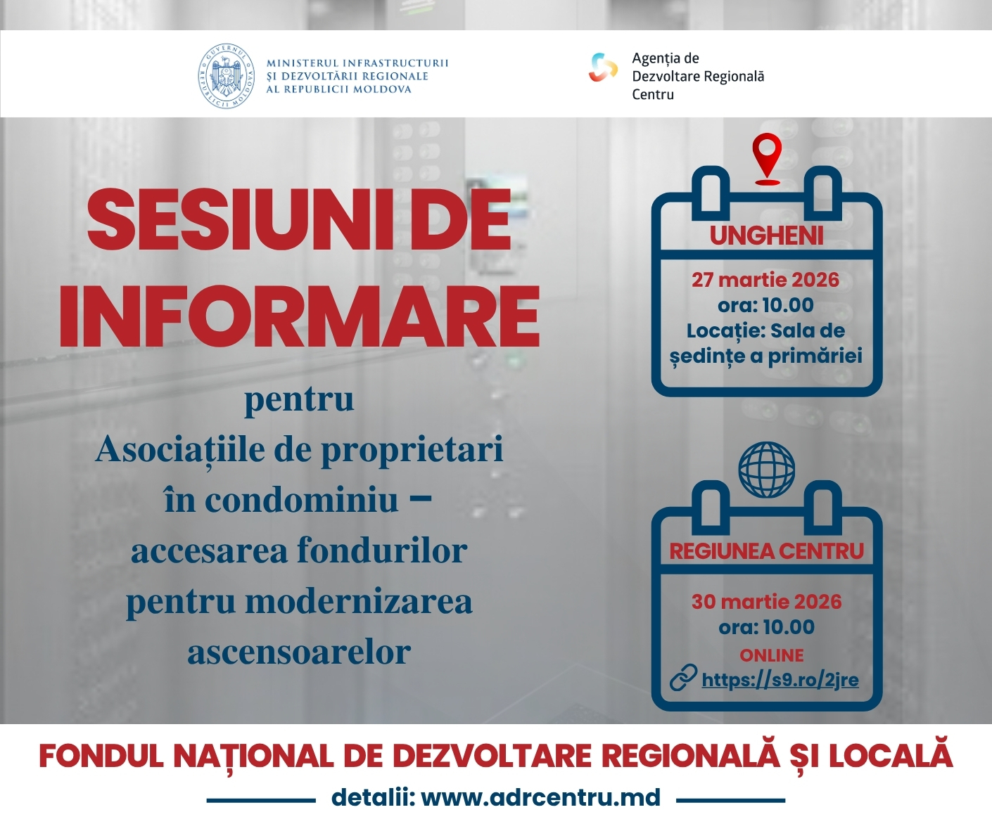 56 Accesări Agenția de Dezvoltare Regională Centru anunță organizarea unor sesiuni de informare dedicate potențialilor beneficiari ai Programului național pilot pentru modernizarea ascensoarelor din clădirile rezidențiale. Activitățile au drept scop informarea și ghidarea persoanelor interesate în procesul de accesare a finanțării disponibile în cadrul acestui program. În cadrul sesiunilor de instruire, participanții vor primi informații detaliate despre condițiile de participare la concurs, criteriile de eligibilitate, etapele procesului de aplicare, precum și despre modul de elaborare și depunere a notelor conceptuale. Prima sesiune se va desfășura în format fizic, în data de 27 martie 2026, cu începere de la ora 10:00, în sala de ședințe a Primăriei municipiului Ungheni. Cea de-a doua sesiune va avea loc în format online, în data de 30 martie 2026, de la ora 10:00, oferind posibilitatea participării unui număr mai larg de beneficiari. Sesiune ONLINE: Evenimentele sunt adresate administratorilor de bloc, membrilor asociațiilor de locatari, cenzorilor și tuturor persoanelor implicate în gestionarea fondului locativ din orașele Anenii Noi, Călărași, Criuleni, Dubăsari, Hîncești, Ialoveni, Nisporeni, Orhei, Rezina, Strășeni, Șoldănești, Telenești și Ungheni. Prin organizarea acestor sesiuni, ADR Centru, sub egida Ministerului Infrastructurii și Dezvoltării Regionale, își propune să sprijine comunitățile locale în procesul de modernizare a infrastructurii locative și să contribuie la creșterea siguranței și confortului locatarilor din Regiunea Centru. Participanții sunt încurajați să valorifice această oportunitate de informare pentru a accesa resursele financiare disponibile în vederea modernizării ascensoarelor din clădirile rezidențiale. |