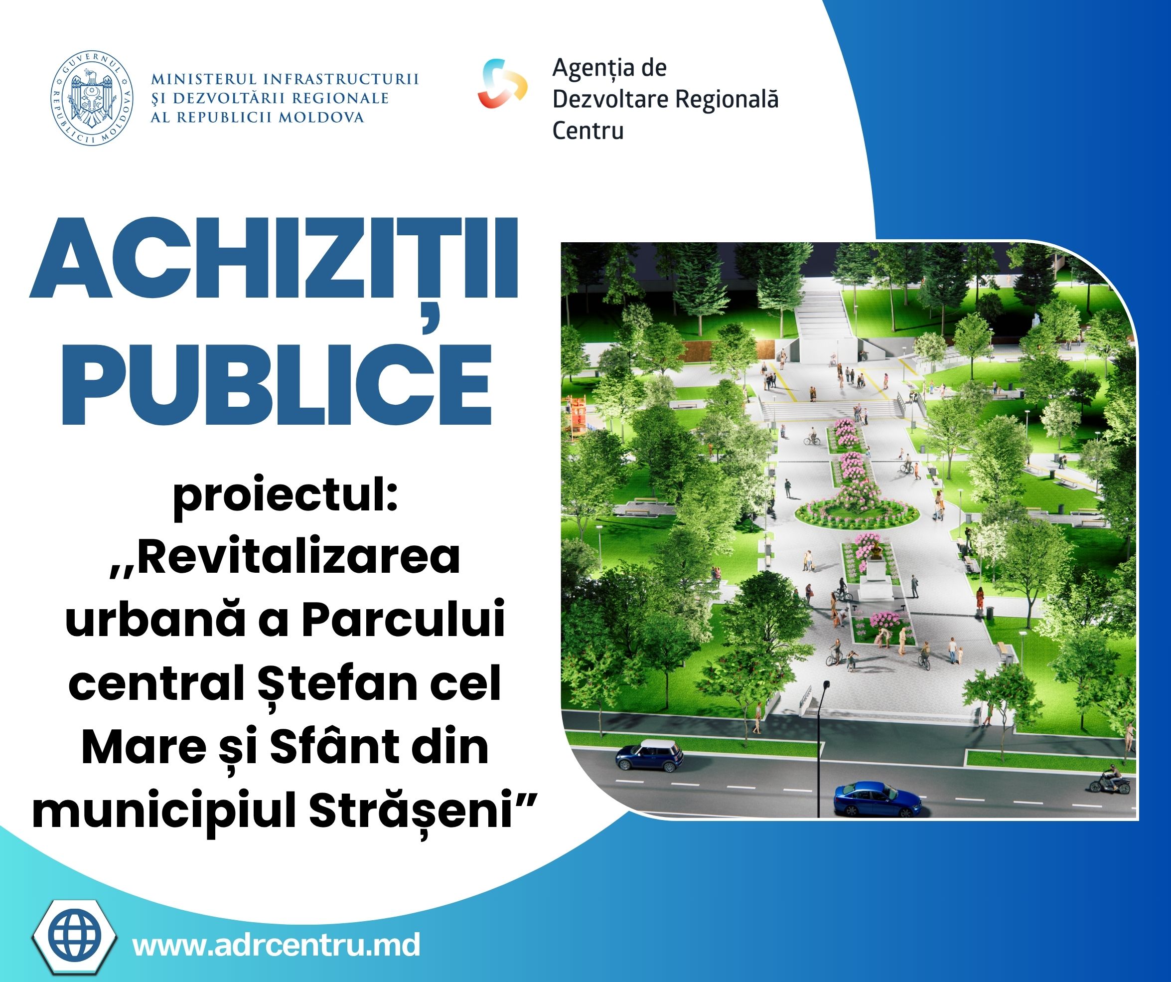 199 Accesări Agenția de Dezvoltare Regională Centru anunță lansarea procedurii de achiziție publică pentru executarea lucrărilor în cadrul proiectului „Revitalizarea urbană a Parcului central Ștefan cel Mare și Sfânt din municipiul Strășeni". Acest proiect are ca scop transformarea parcului central într-un spațiu public modern, accesibil și atractiv, care să răspundă nevoilor comunității și să contribuie la creșterea calității vieții locuitorilor. Prin intervențiile planificate, parcul va fi reabilitat și modernizat, devenind un loc prietenos pentru recreere, socializare și petrecerea timpului liber. Lucrările prevăzute includ reabilitarea a 7 alei pietonale, modernizarea și extinderea terenului de joacă, construcția unui grup sanitar public, precum și amenajarea unei parcări auto. Totodată, vor fi create și extinse zonele verzi și recreative, fiind asigurată protejarea biodiversității locale printr-o gestionare durabilă a spațiului verde. Proiectul mai prevede implementarea unui sistem eficient de irigare și canalizare pluvială. În urma realizării investiției, municipiul Strășeni va beneficia de un parc urban revitalizat, cu o suprafață de aproximativ 1,84 hectare, infrastructură modernizată și condiții îmbunătățite pentru toți utilizatorii. De aceste îmbunătățiri vor beneficia direct instituțiile educaționale și culturale din municipiu, agenții economici din zonă, organizațiile societății civile și vizitatorii orașului, iar pe termen lung - peste 14 500 de locuitori. Valoarea estimată a lucrărilor este de 20 044 925 lei (fără TVA), finanțarea fiind asigurată din Fondul Național pentru Dezvoltare Regională și Locală (FNDRL), cu contribuția autorităților publice locale. Procedura de achiziție se desfășoară conform următorului calendar: