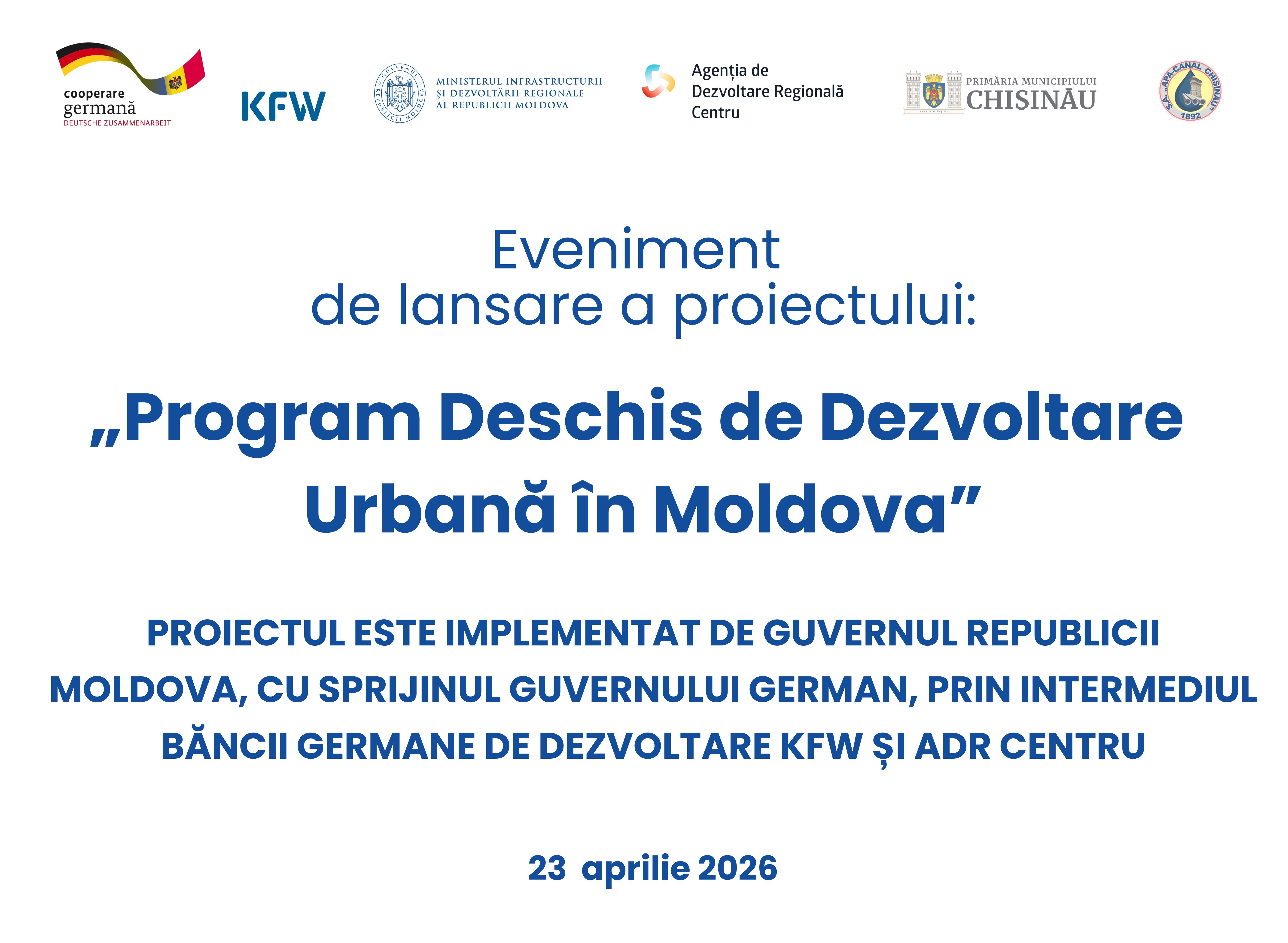 120 Accesări INVITAȚIE pentru PRESĂ CINE? Ministerul Infrastructurii și Dezvoltării Regionale și Agenția de Dezvoltare Regională Centru CE? Invită instituțiile mass-media la evenimentul de semnare a Acordurilor de finanțare și implementare în cadrul proiectului „Program Deschis de Dezvoltare Urbană în Moldova" CÂND? Joi, 23 aprilie 2026, ora 10.00 UNDE? Vadul lui Vodă, Stația de captare a apei de pe râul Nistru Coordonate locație: https://maps.app.goo.gl/tyv1HGziytsU9Goh8 INVITAȚI: Membri ai corpului diplomatic, parteneri de dezvoltare, ministere, beneficiari ai proiectului de dezvoltare regională și reprezentanți mass-media. DETALII: Agenția de Dezvoltare Regională Centru, prin intermediul Unității de implementare a proiectelor externe cu finanțare germană, implementează proiectul „Program Deschis de Dezvoltare Urbană în Moldova", realizat de Guvernul Republicii Moldova cu sprijinul financiar al Guvernului Federal German, prin Banca Germană de Dezvoltare KfW. Proiectul este implementat în sinergie cu inițiativa „Îmbunătățirea infrastructurii de apă în Moldova Centrală", contribuind împreună la modernizarea infrastructurii de apă, creșterea capacității sistemelor existente și extinderea accesului populației la servicii sigure și moderne. Date cheie ale proiectului:
