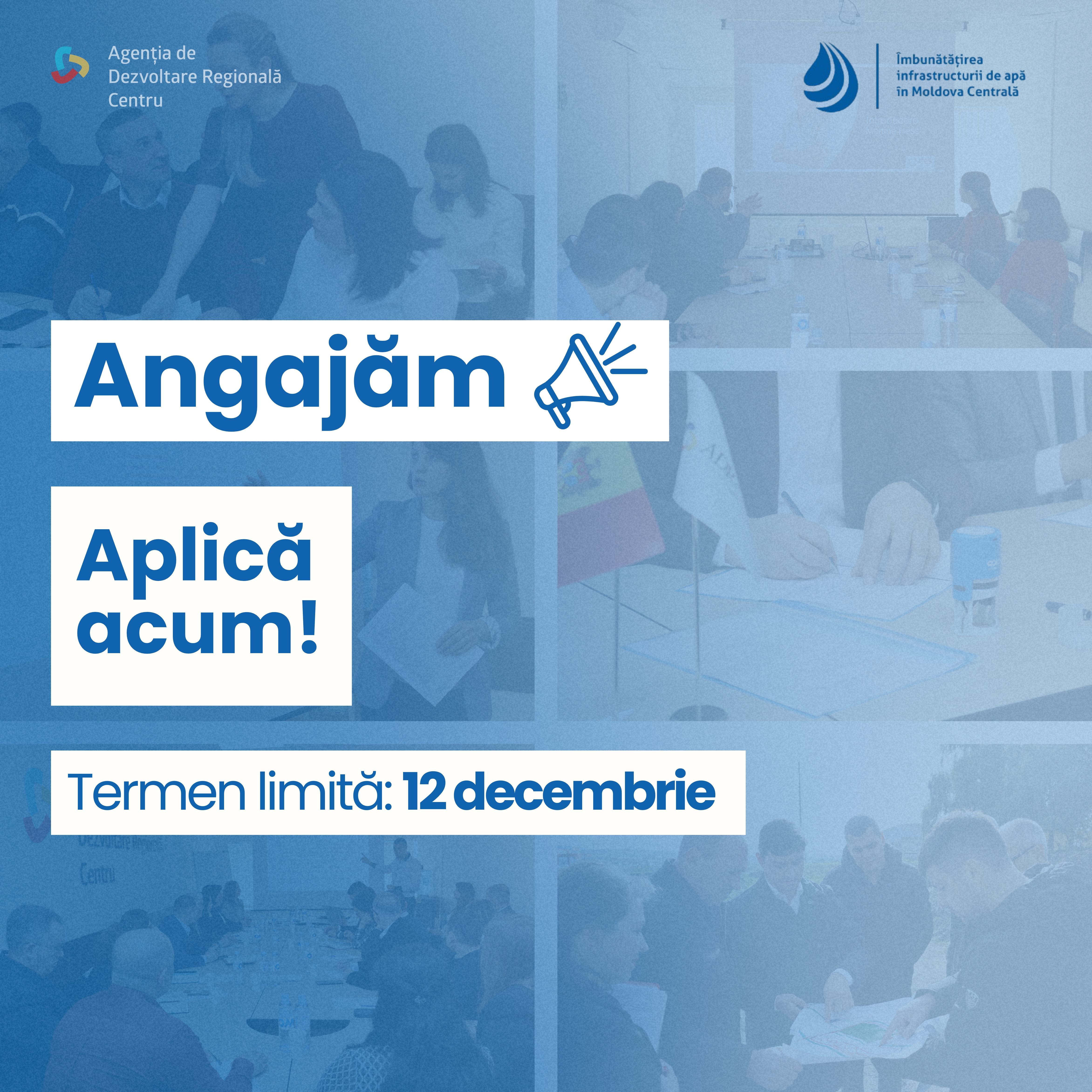 371 Accesări Agenția de Dezvoltare Regională (ADR) Centru anunță concurs pentru ocuparea funcției de Expert în domeniul mediului și social în cadrul Unității de Implementare a Proiectului (UIP) „Îmbunătățirea infrastructurii de apă în Moldova Centrală". Condiții de participare și remunerare: Termen-limită de depunere a dosarelor: 12 decembrie 2025 Modalități de transmitere a dosarelor:
